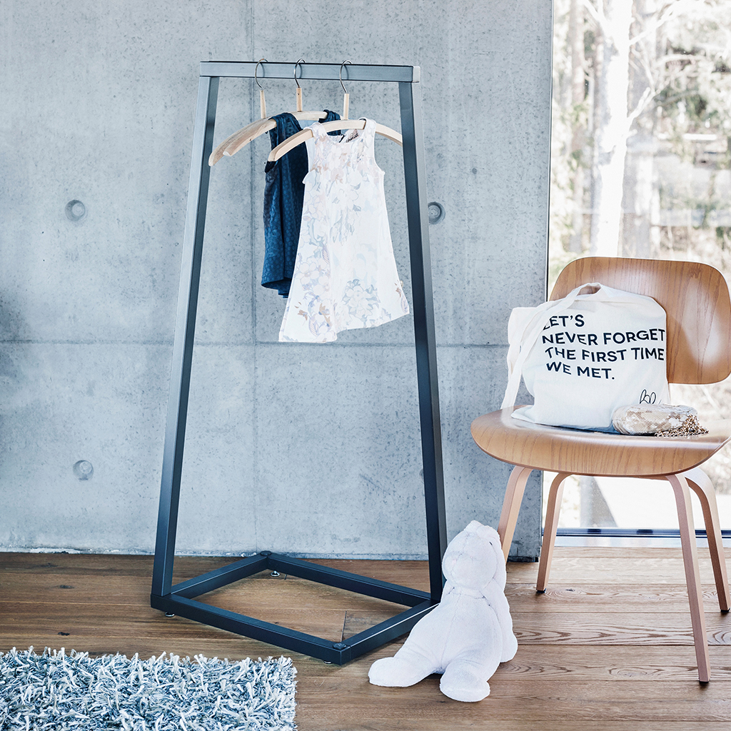 The rack is supported by diagonal bars that start from a rectangular base. This simple but aesthetic design brings originality to your wardrobe while ensuring good stability.