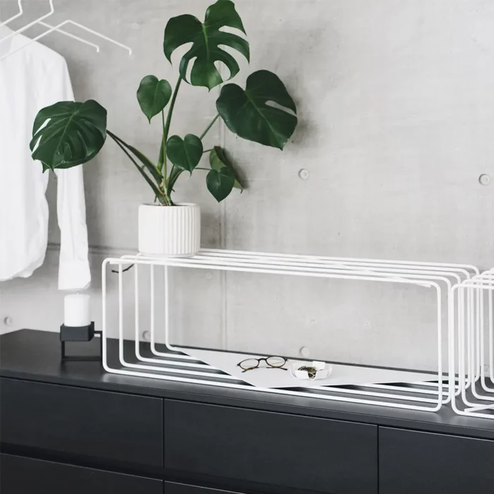 Ce meuble design s’utilise seul ou associé au porte-manteau Lume pour créer un espace de rangement minimaliste et multifonctionnel tel qu’un meuble d’entrée porte manteau et chaussures. Bottes, escarpins ou baskets peuvent y être déposés, ainsi que des plantes et d’autres objets décoratifs. Créez votre propre style en l’utilisant comme meuble tv design, table d’appoint de salon ou porte-revues !