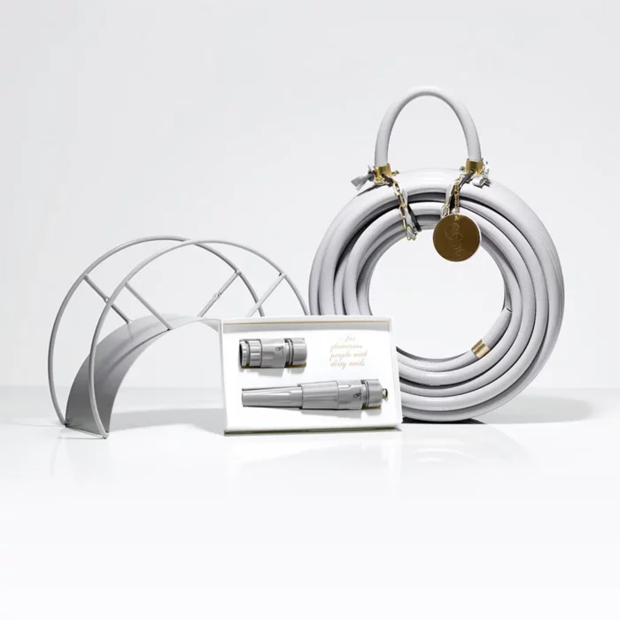 Ce kit contient un tuyau d’arrosage, un support mural assorti et un ensemble de buses dans la même couleur.